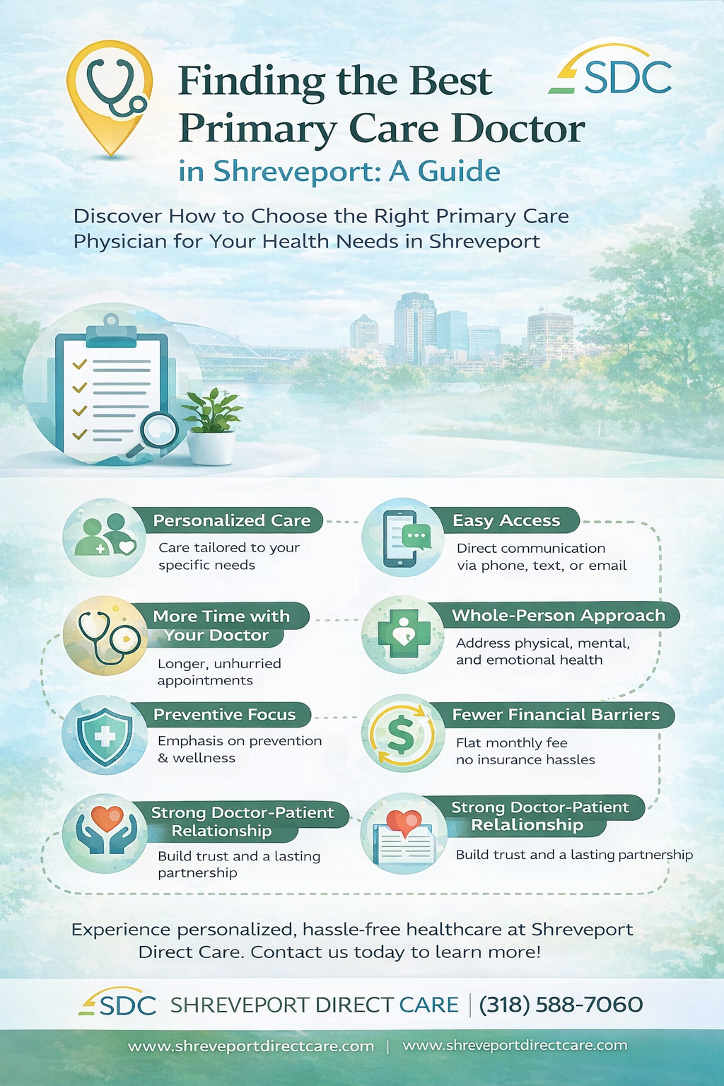 Accessibility and location are crucial factors to consider when choosing a primary care doctor in Shreveport. A conveniently located doctor's office can make a significant difference in your ability to attend appointments regularly, especially if you have a busy schedule or limited transportation options. Consider the distance from your home or workplace and the ease of access to the office. A location with ample parking, public transportation options, and minimal traffic congestion can make your visits more convenient and less stressful. In a direct primary care or concierge model you will have increased access and longer appointment.