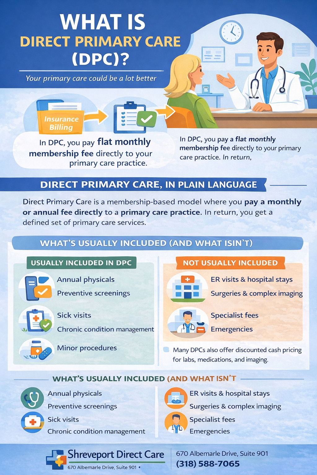 If you’re looking for Direct Primary Care in Shreveport, our model at Shreveport Direct Care is built for everyone from busy families to modern work schedules. Many remote professionals choose our Direct Primary Care membership for predictable costs and easy access.